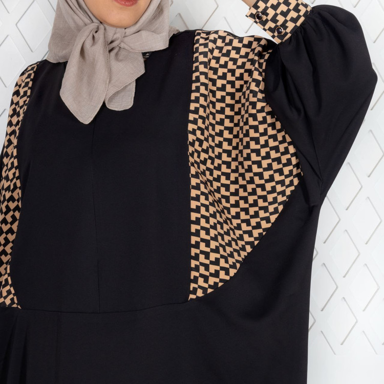 مانتو مدل پروانه با طراحی مونوکروم و جزئیات هندسی در سرشانه و سرآستینها، جلوهای متفاوت و مدرن به استایل شما میبخشد. ترکیب پارچهی مشکی با نقشهای کرم، حس تعادل میان سادگی و جسارت را ایجاد کرده و فرم ایستاده و قد بلند مانتو، ظاهری شیک و موقر ارائه میدهد.