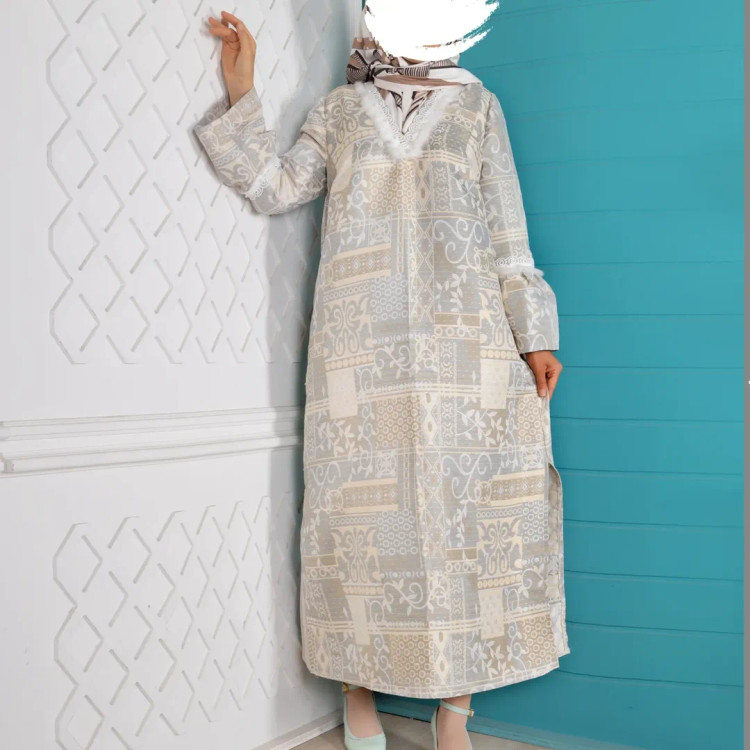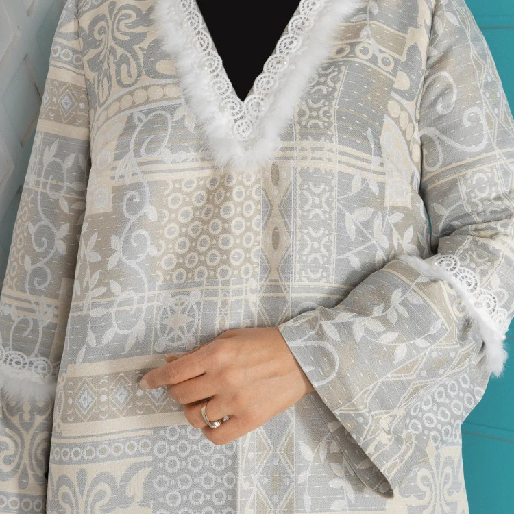 کفتان مدل سفید برفی | ژاکارد با ترکیب یراق مرواریدی، آستین کلوش – سایزبندی، قد ۱۴۰ سانت – رنگ بندی